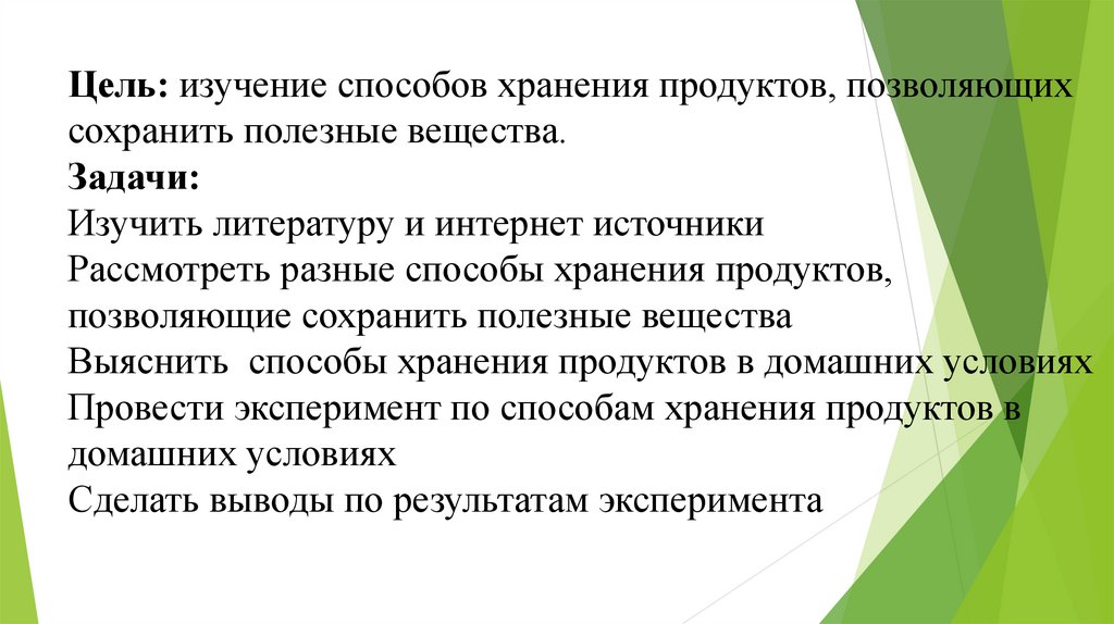 Цель: изучение способов хранения продуктов, позволяющихсохранить полезные вещества.