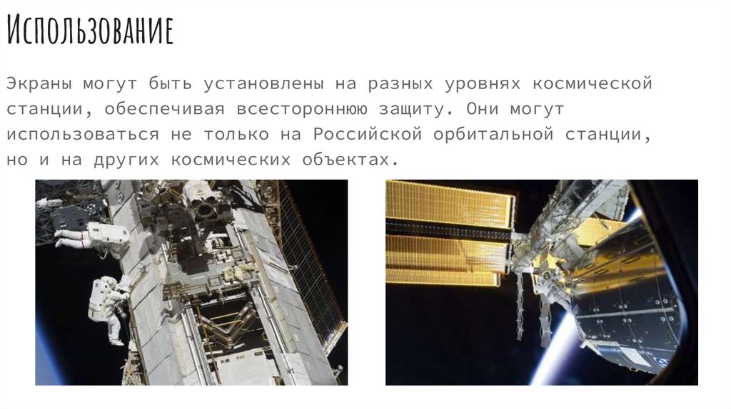ИспользованиеЭкраны могут быть установлены на разных уровнях космической