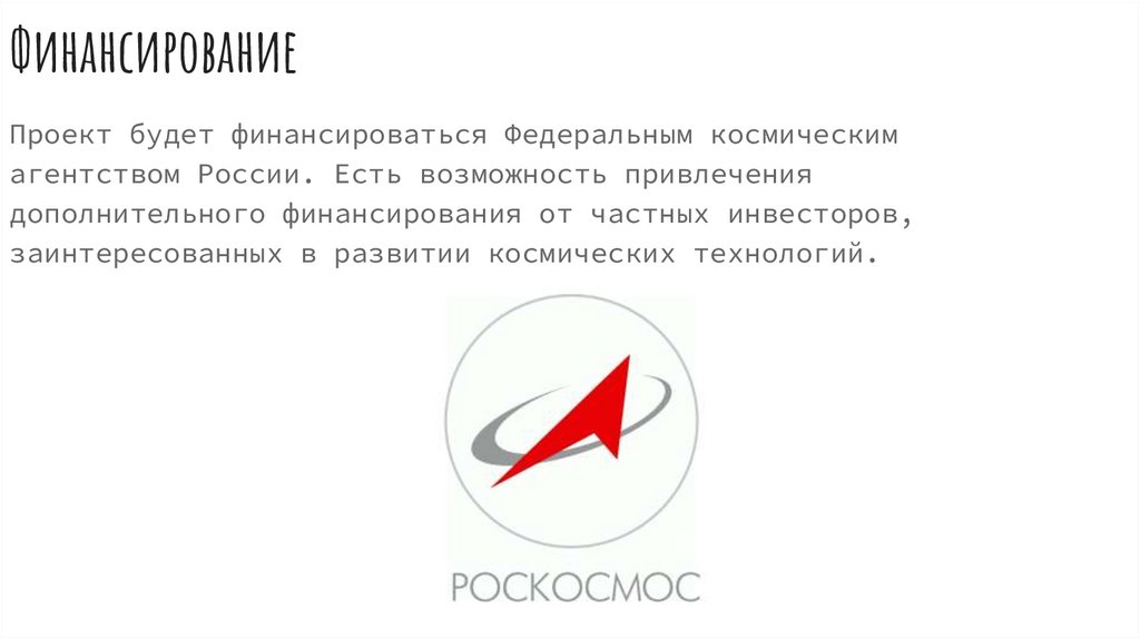 ФинансированиеПроект будет финансироваться Федеральным космическим