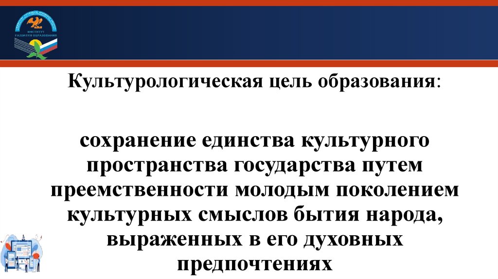 Культурологическая цель образования:сохранение единства культурного