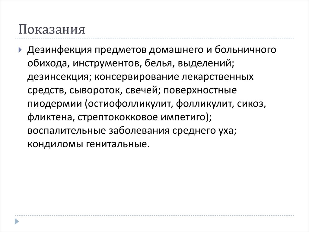 ПоказанияДезинфекция предметов домашнего и больничного