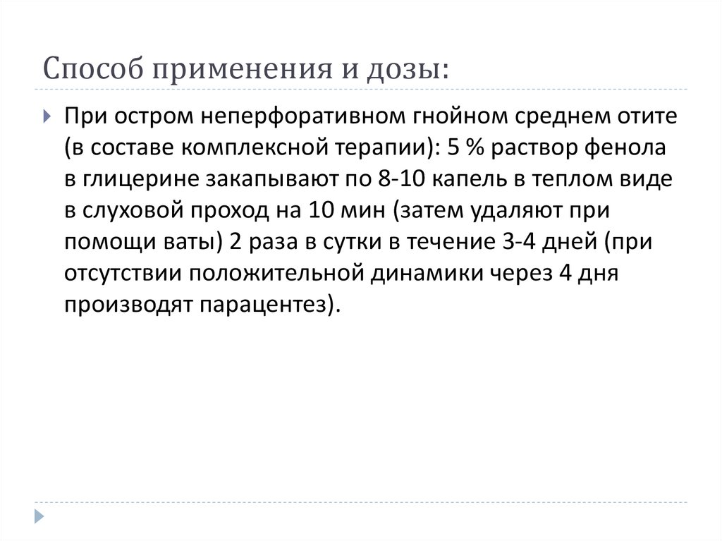 Способ применения и дозы:При остром неперфоративном гнойном среднем отите