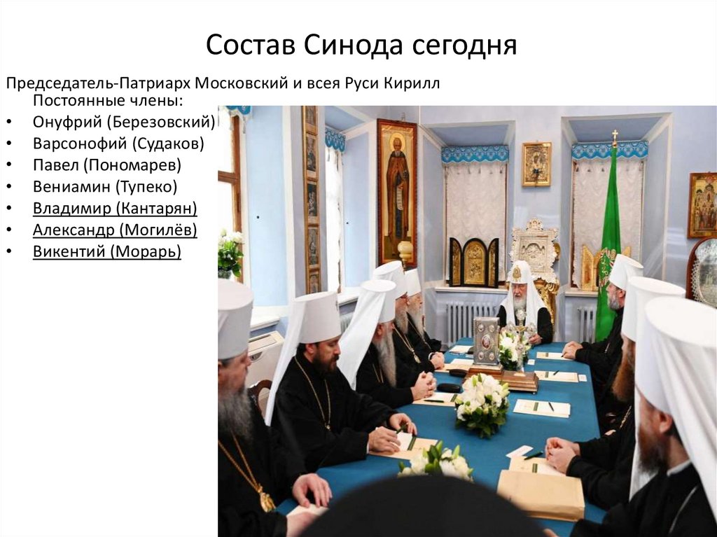 Состав Синода сегодняПредседатель-Патриарх Московский и всея Руси Кирилл