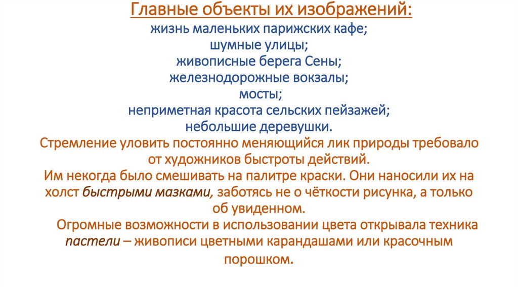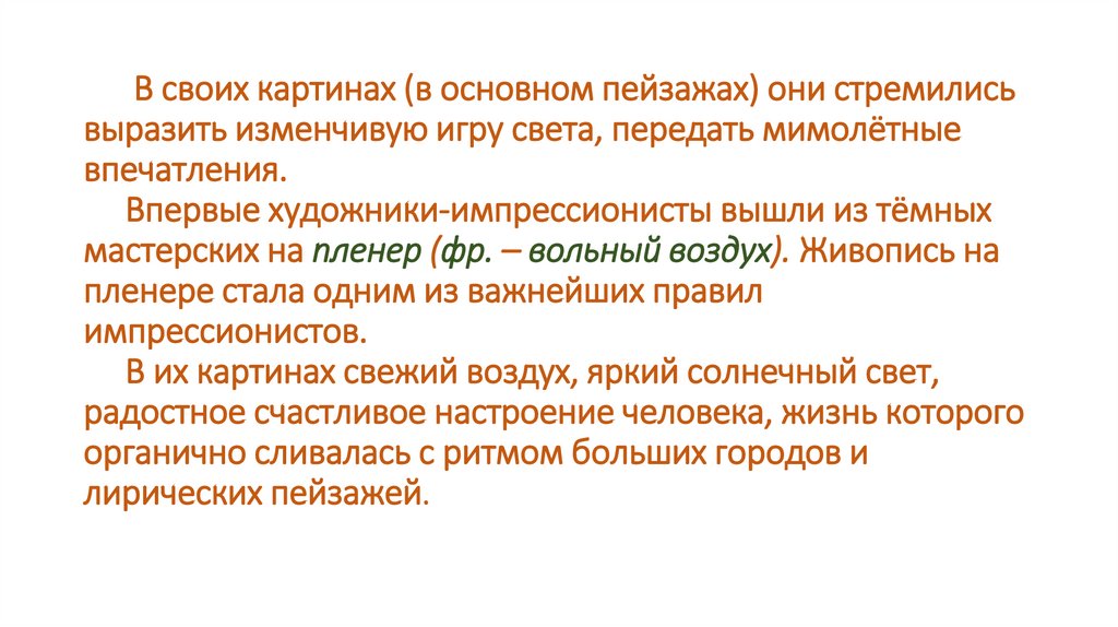 В своих картинах (в основном пейзажах) они стремилисьвыразить изменчивую игру света, передать мимолётные