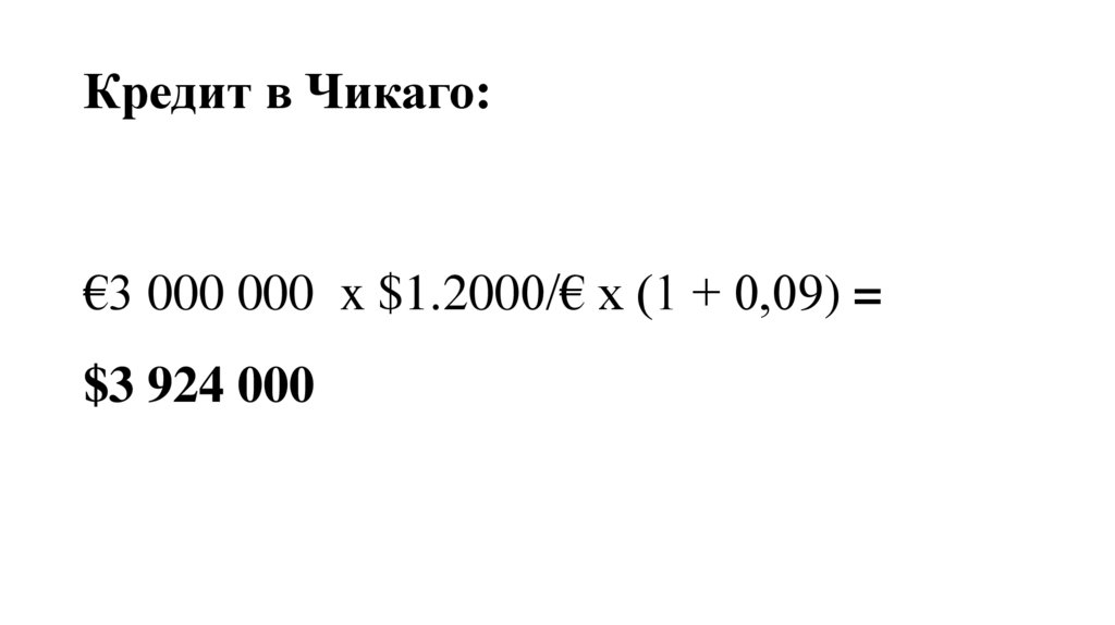 Кредит в Чикаго:€3 000 000 x $1.2000/€ x (1 + 0,09) =