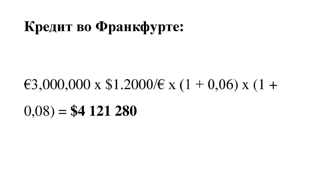 Кредит во Франкфурте:€3,000,000 x $1.2000/€ x (1 + 0,06) x (1 +