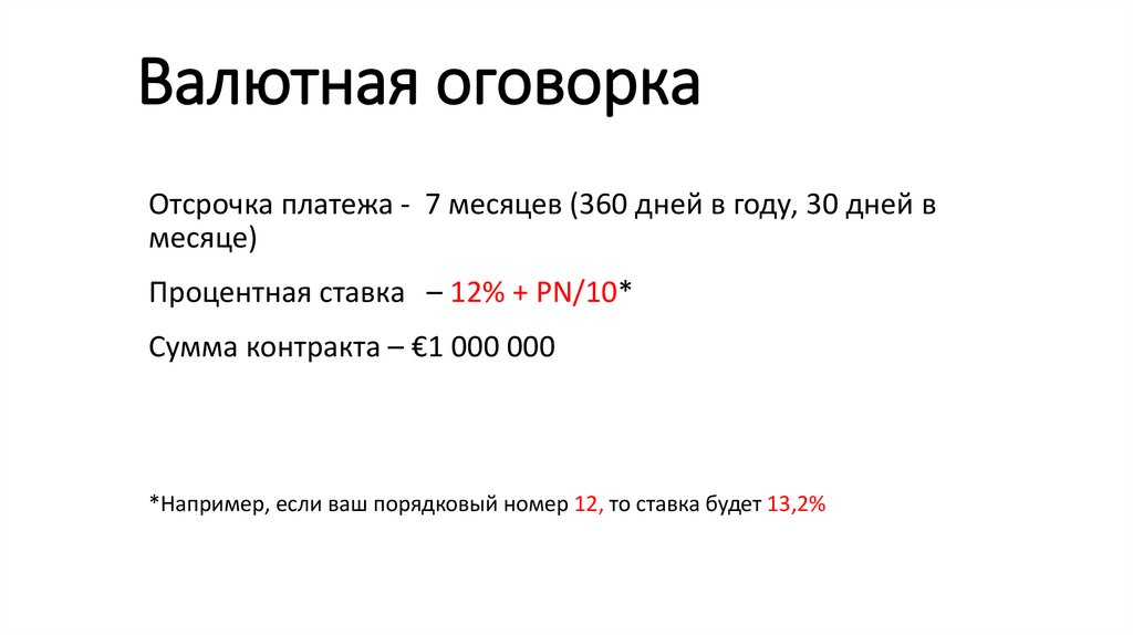 Валютная оговоркаОтсрочка платежа - 7 месяцев (360 дней в году, 30 дней в