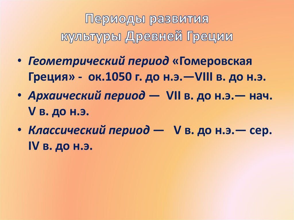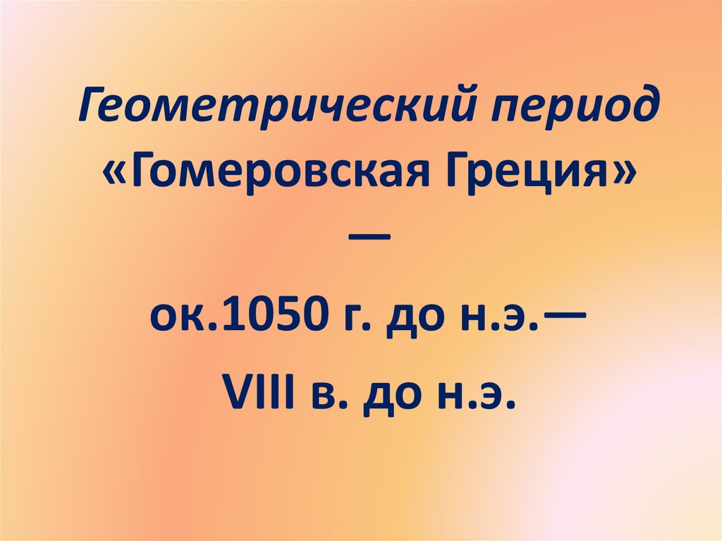 • Геометрический период «ГомеровскаяГреция» - ок.1050 г. до н.э.—VIII в. до н.э.