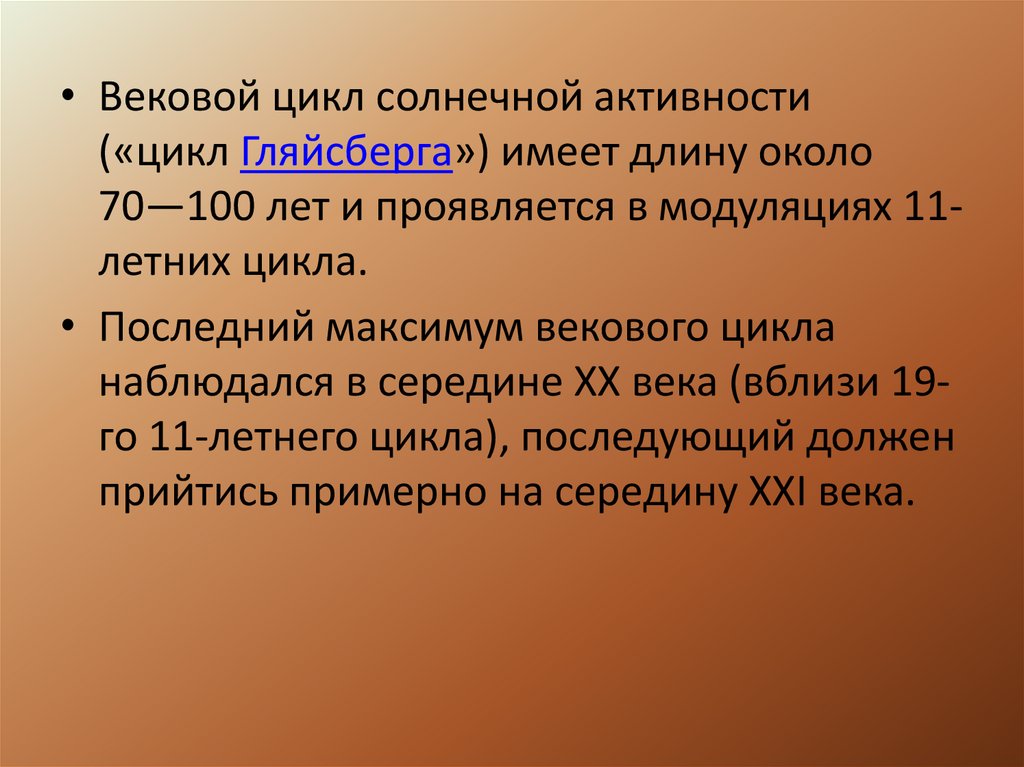 • Вековой цикл солнечной активности(«цикл Гляйсберга») имеет длину около