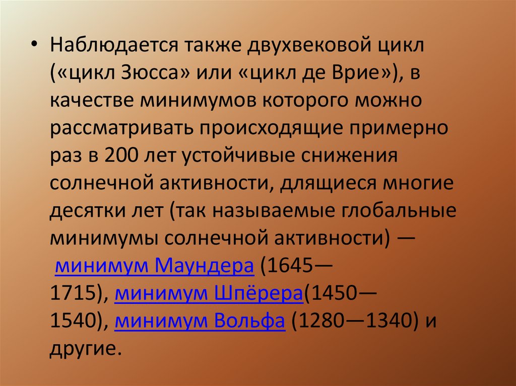 • Наблюдается также двухвековой цикл(«цикл Зюсса» или «цикл де Врие»), в