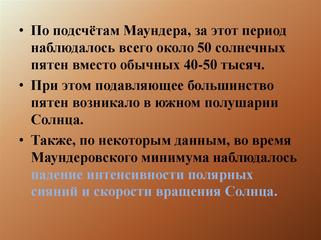• По подсчётам Маундера, за этот периоднаблюдалось всего около 50 солнечных