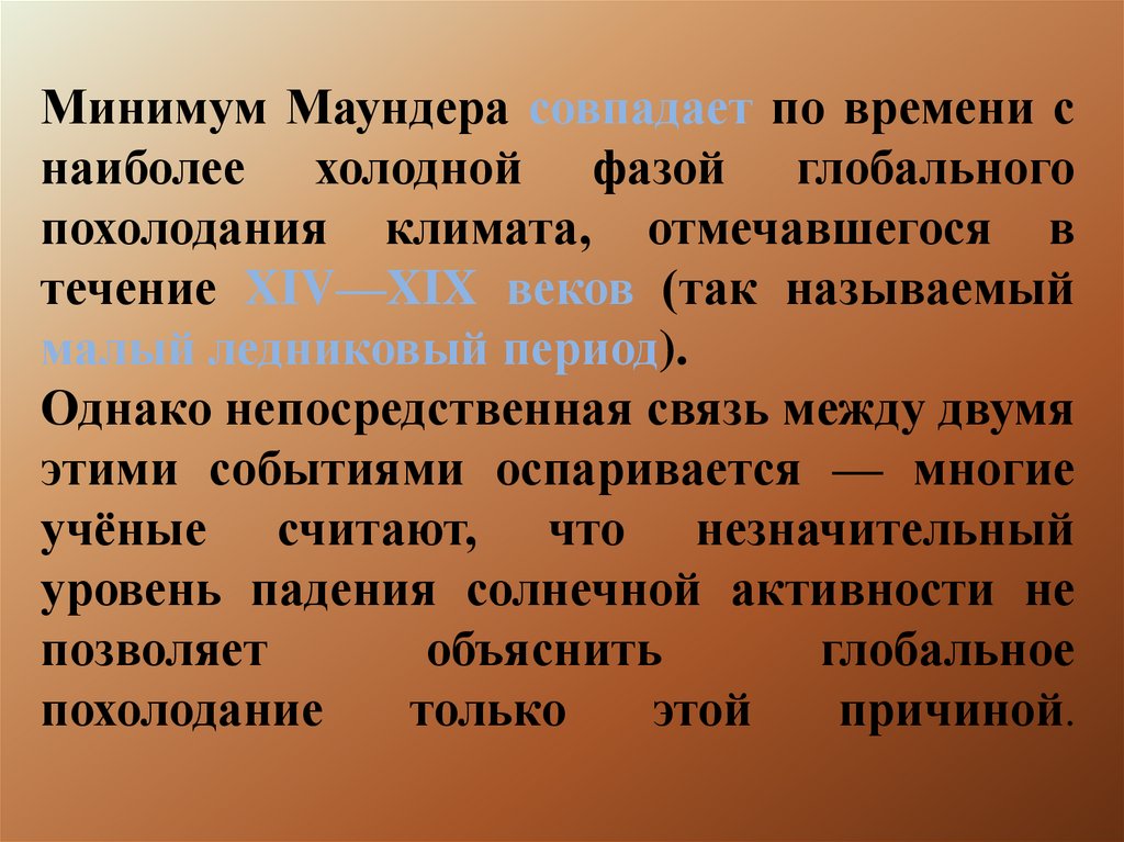 Минимум Маундера совпадает по времени снаиболее холодной фазой глобального