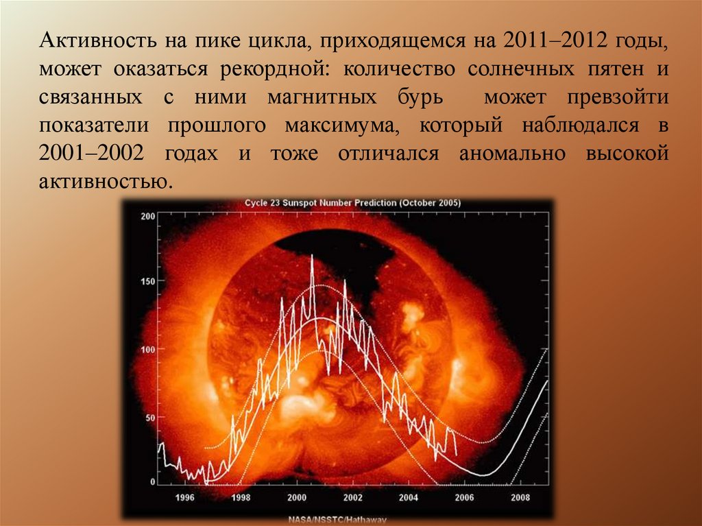 Активность на пике цикла, приходящемся на 2011–2012 годы,может оказаться рекордной: количество солнечных пятен и