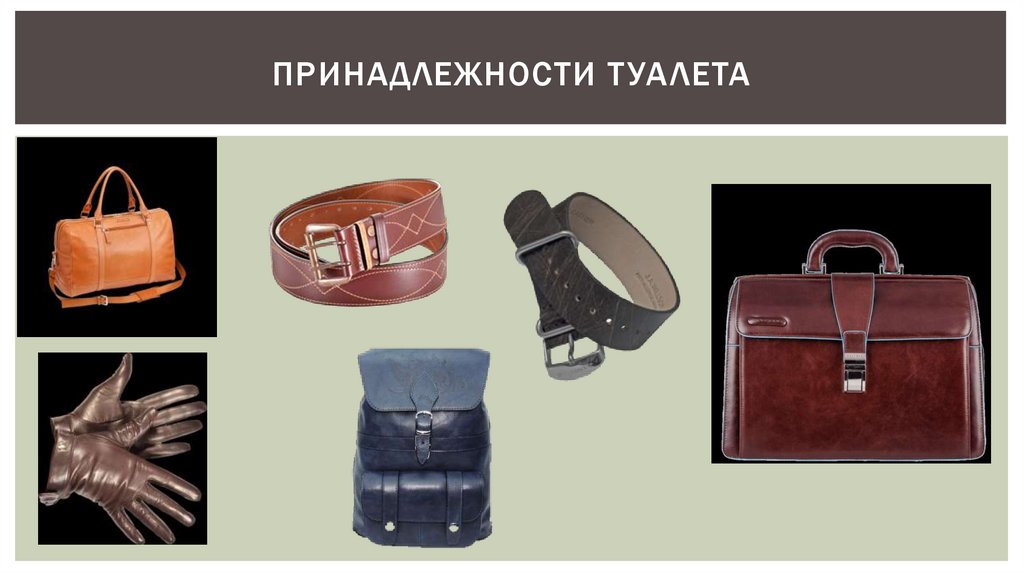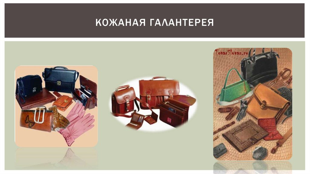 ИЗДЕЛИЯ ДЕЛЯТ НА ТРИ ПОДГРУППЫ:принадлежности туалета — сумки, перчатки, ремни,