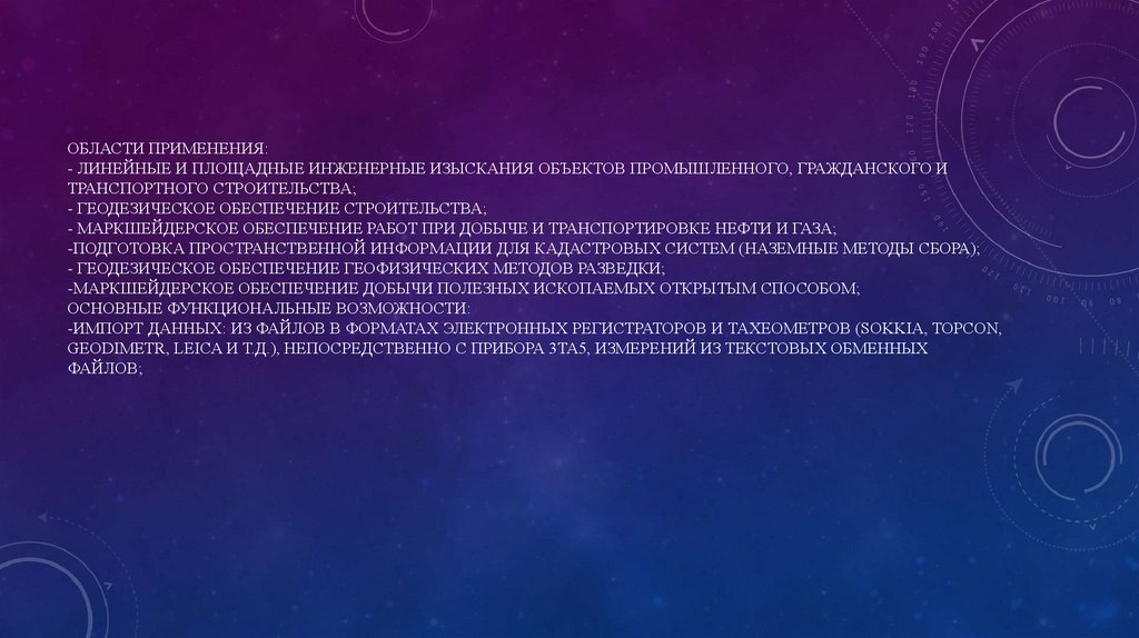 ОБЛАСТИ ПРИМЕНЕНИЯ:- ЛИНЕЙНЫЕ И ПЛОЩАДНЫЕ ИНЖЕНЕРНЫЕ ИЗЫСКАНИЯ ОБЪЕКТОВ ПРОМЫШЛЕННОГО,