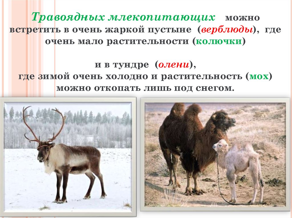 Травоядных млекопитающих можновстретить в очень жаркой пустыне (верблюды), где