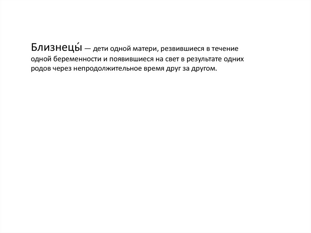 Близнецы́ — дети одной матери, резвившиеся в течениеодной беременности и появившиеся на свет в результате одних