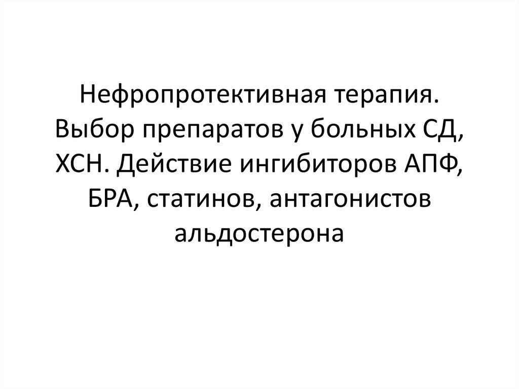 1. Нефропротективная терапия. Выбор препаратов у больных СД, ХСН. Действие ингибиторов АПФ, БРА, статинов, антагонистов альдостерона