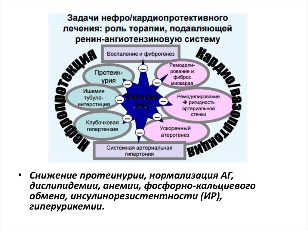 • Снижение протеинурии, нормализация АГ,дислипидемии, анемии, фосфорно-кальциевого