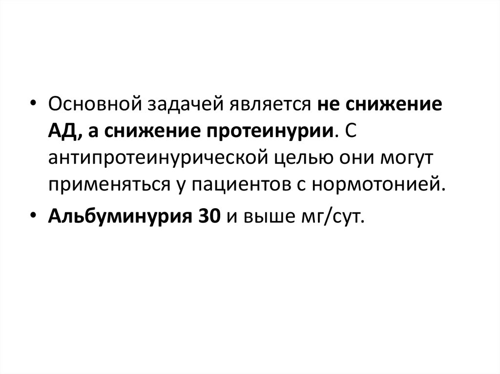 • Основной задачей является не снижениеАД, а снижение протеинурии. С