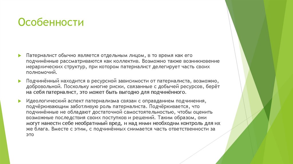 ОсобенностиПатерналист обычно является отдельным лицом, в то время как его