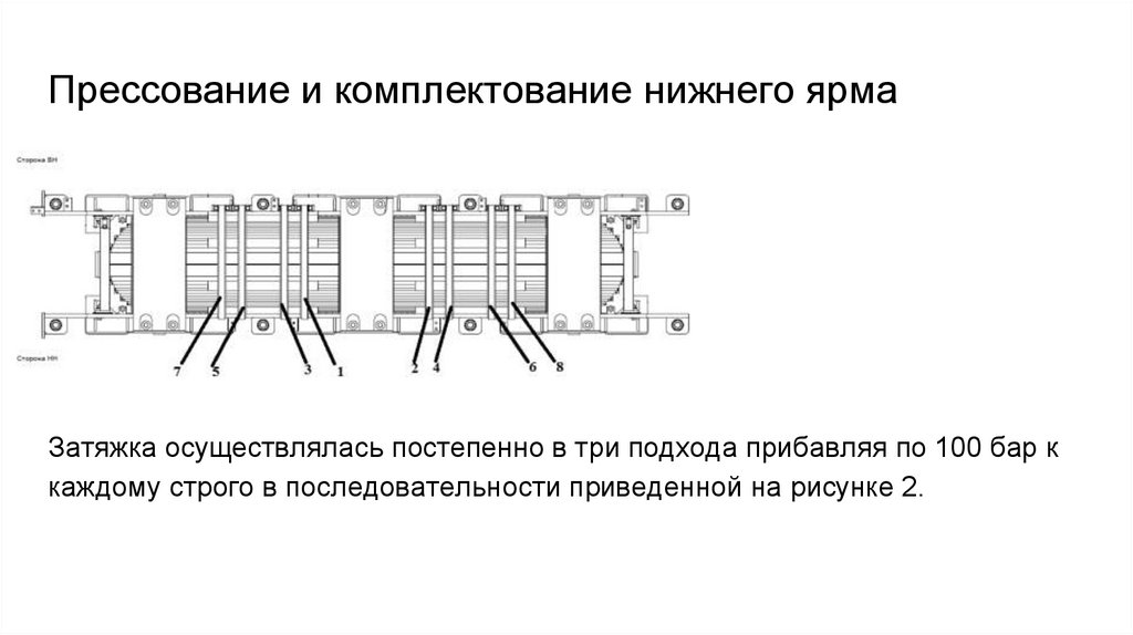 Прессование и комплектование нижнего ярмаЗатяжка осуществлялась постепенно в три подхода прибавляя по 100 бар к