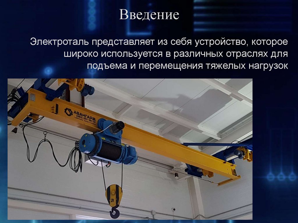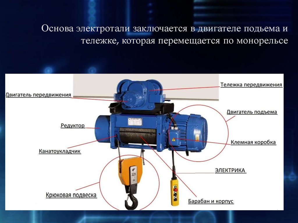 Основа электротали заключается в двигателе подьема итележке, которая перемещается по монорельсе