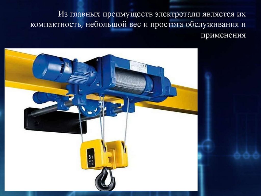 Из главных преимуществ электротали является ихкомпактность, небольшой вес и простота обслуживания и