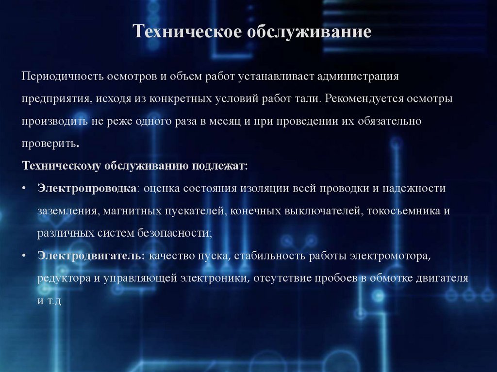 1. Изучить техническое обслуживание электрооборудования электротали