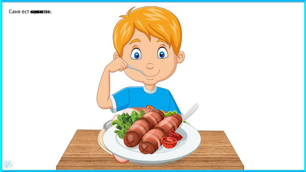 Саня ест сосиски.