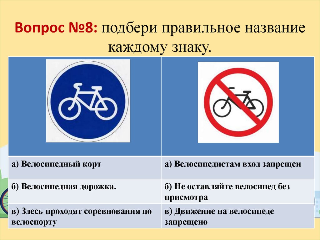 Вопрос №8: подбери правильное названиекаждому знаку.