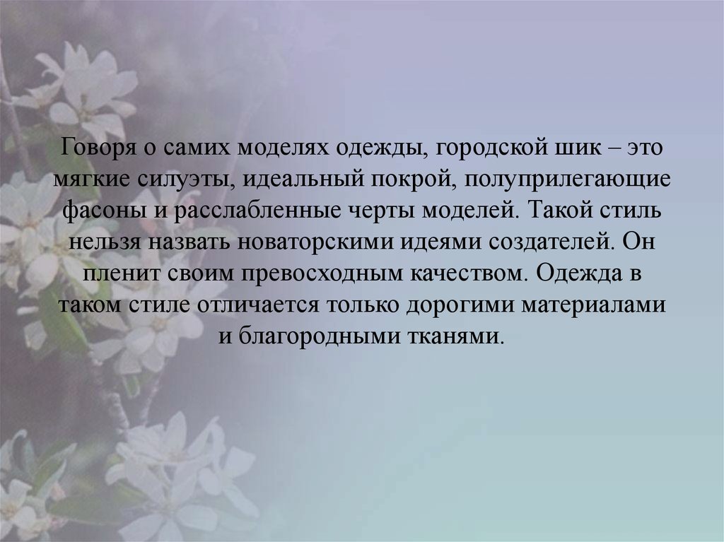 Говоря о самих моделях одежды, городской шик – этомягкие силуэты, идеальный покрой, полуприлегающие