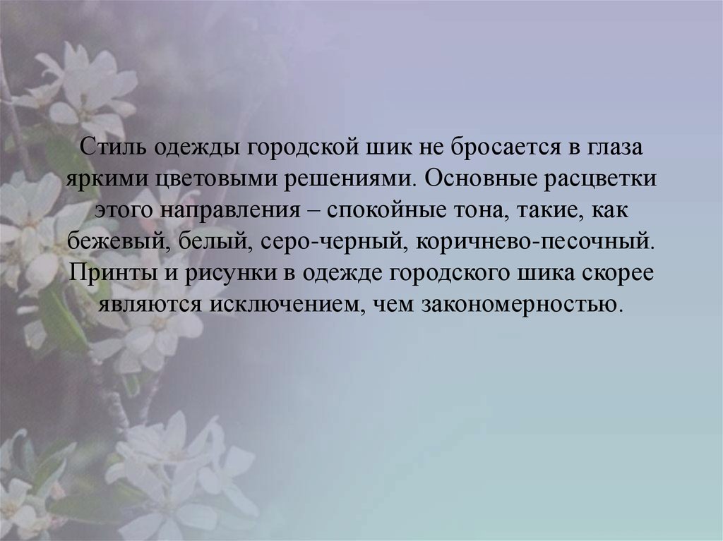 Стиль одежды городской шик не бросается в глазаяркими цветовыми решениями. Основные расцветки