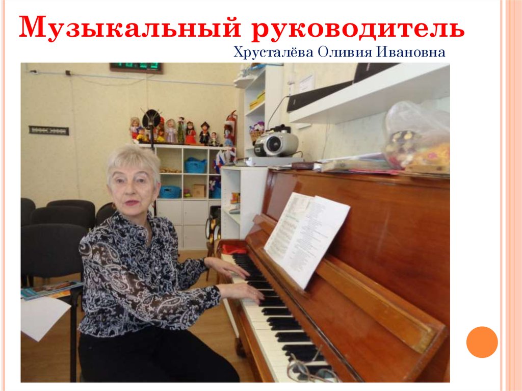 Музыкальный руководительХрусталёва Оливия Ивановна