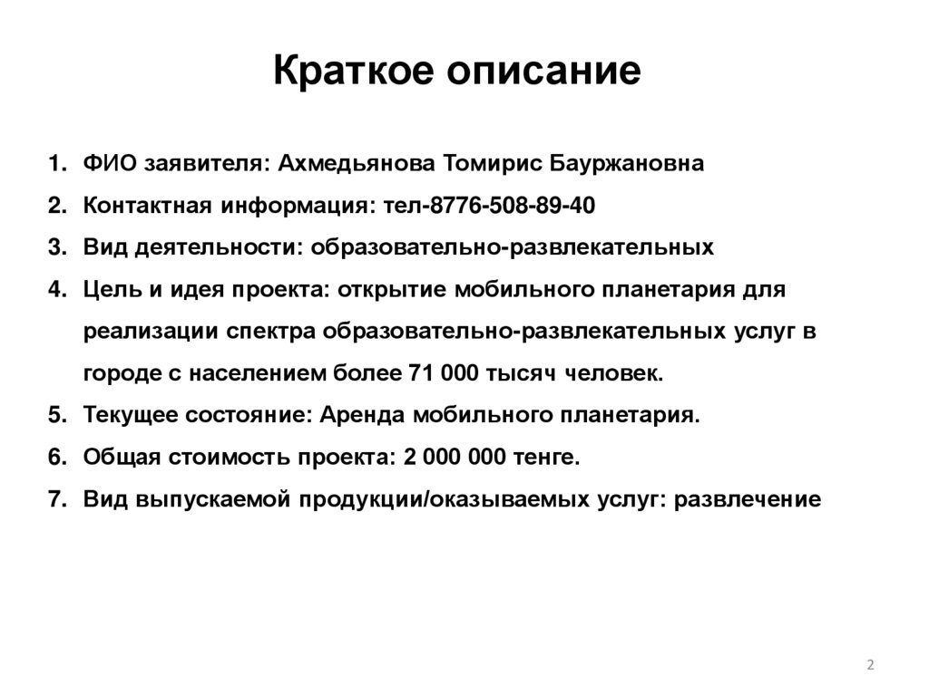 Краткое описание1. ФИО заявителя: Ахмедьянова Томирис Бауржановна