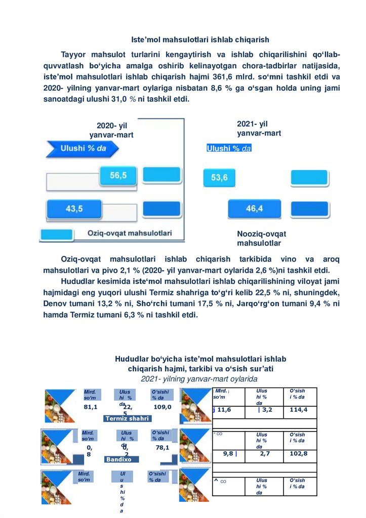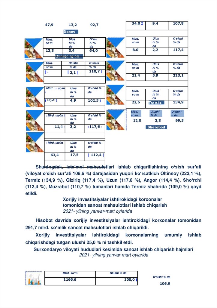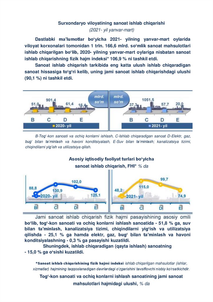 Surxondaryo viloyatining sanoat ishlab chiqarishi(2021- yil yanvar-mart)