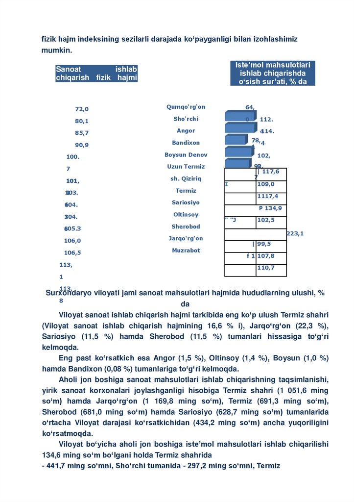 (11,3 %), Sariosiyo (25,7 %), Jaqo‘rg‘on (30,8 %), Termiz (33,0 %), Sho‘rchi (33,0