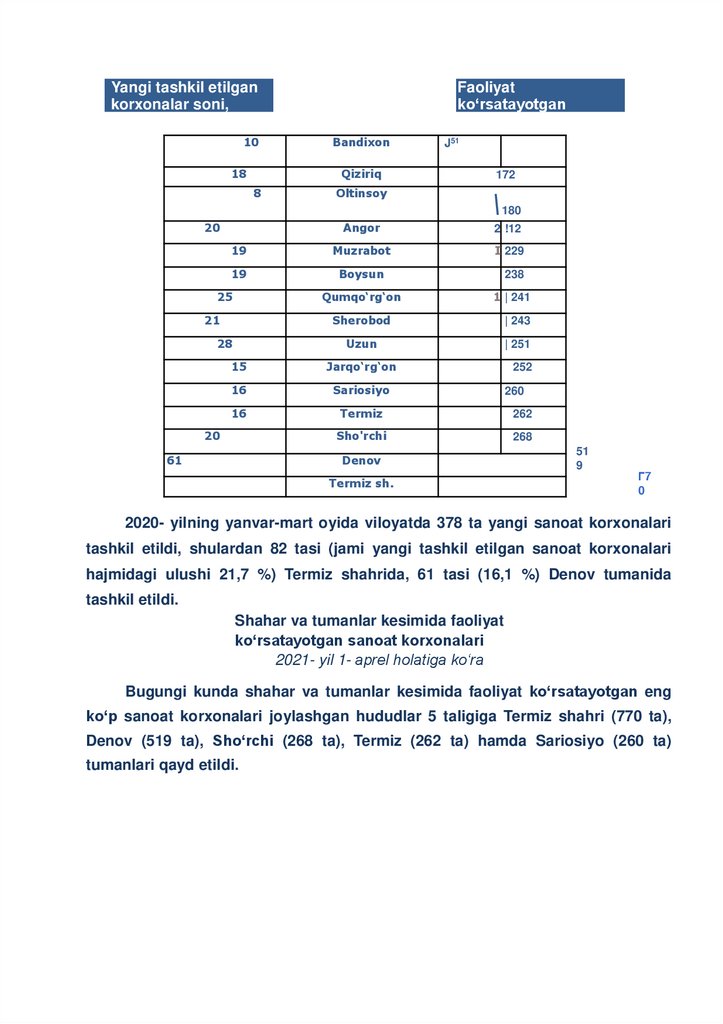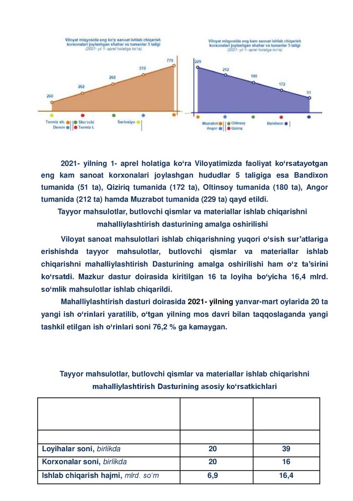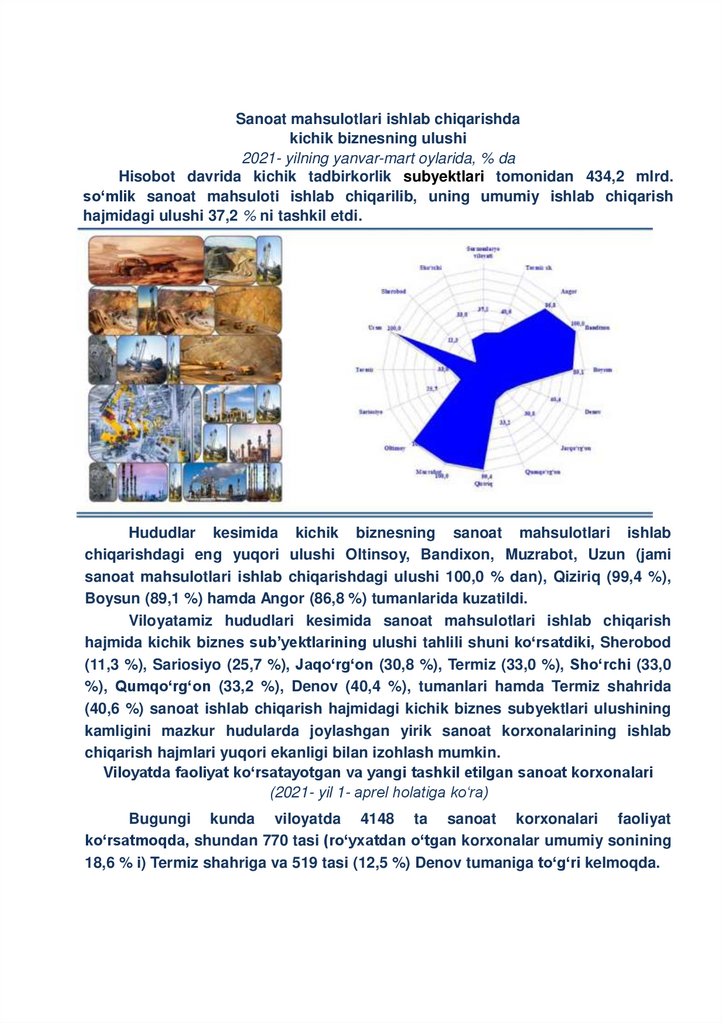 2021- yilning 1- aprel holatiga ko‘ra Viloyatimizda faoliyat ko‘rsatayotganeng kam sanoat korxonalari joylashgan hududlar 5 taligiga esa Bandixon