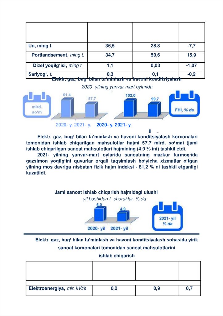 2021- yilning yanvar-mart oylarida ishlab chiqarilgan mahsulotlar hajmi
