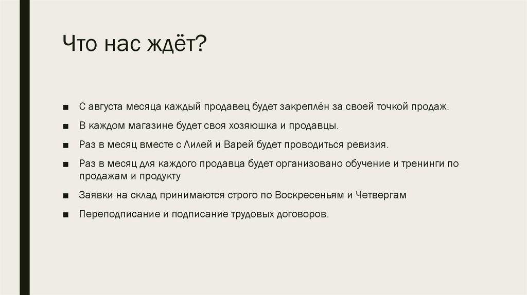Что нас ждёт?■ С августа месяца каждый продавец будет закреплён за своей точкой продаж.