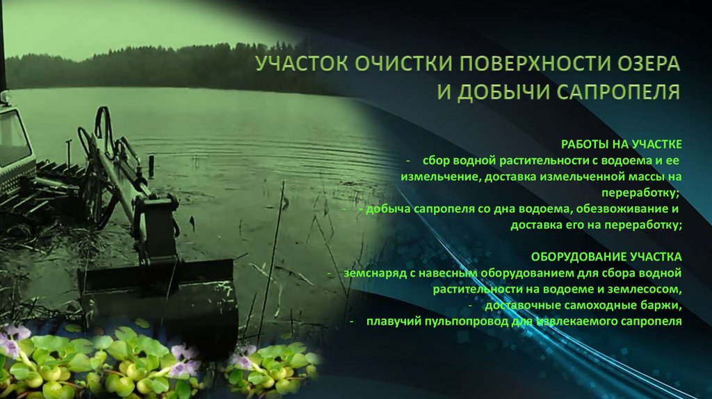 Технология добычи сапропеля основывается на малозатратномфрезерно-гидравлическом способе, а производство продукции –