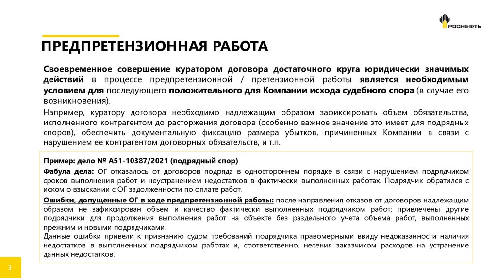 ПРЕДПРЕТЕНЗИОННАЯ РАБОТАСвоевременное совершение куратором договора достаточного круга юридически значимых