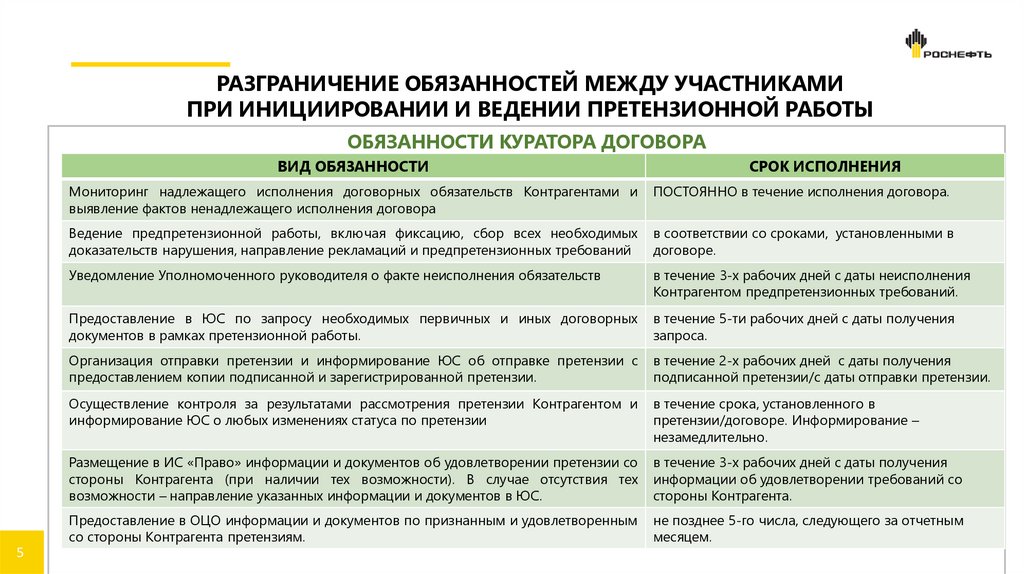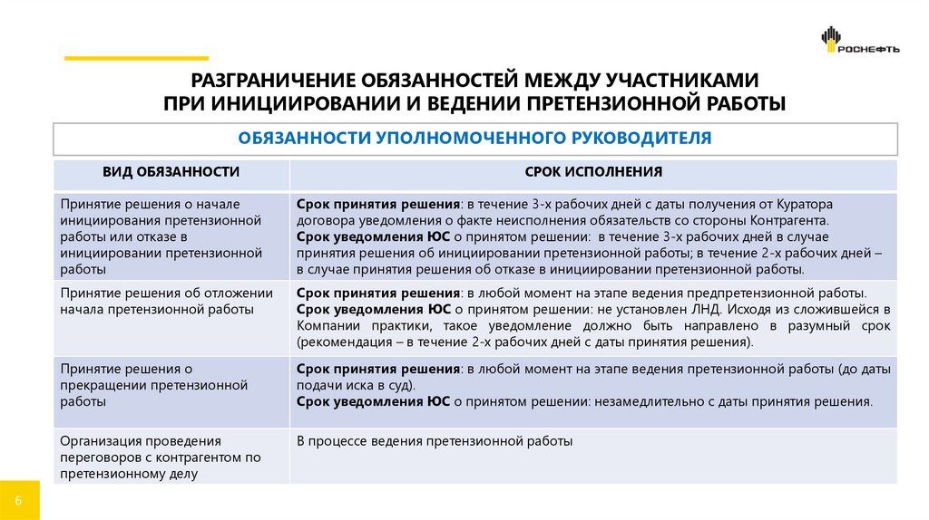 принятия решения об инициировании претензионной работы; в течение 2-х рабочих дней –