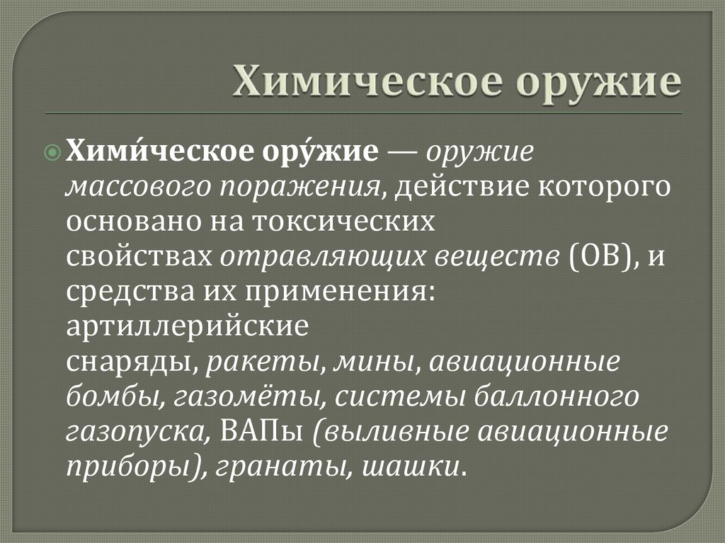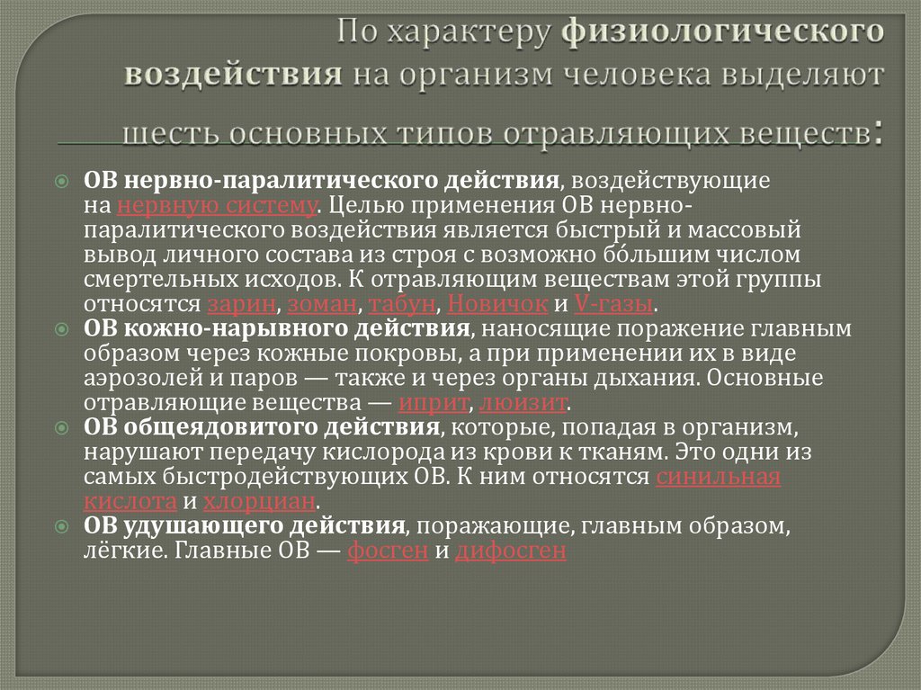 ОВ нервно-паралитического действия, воздействующиена нервную систему. Целью применения ОВ нервнопаралитического воздействия является быстрый и массовый
