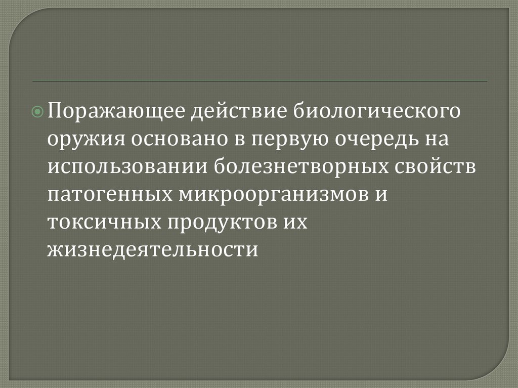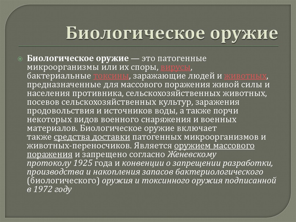 Биологическое оружие — это патогенныемикроорганизмы или их споры, вирусы,