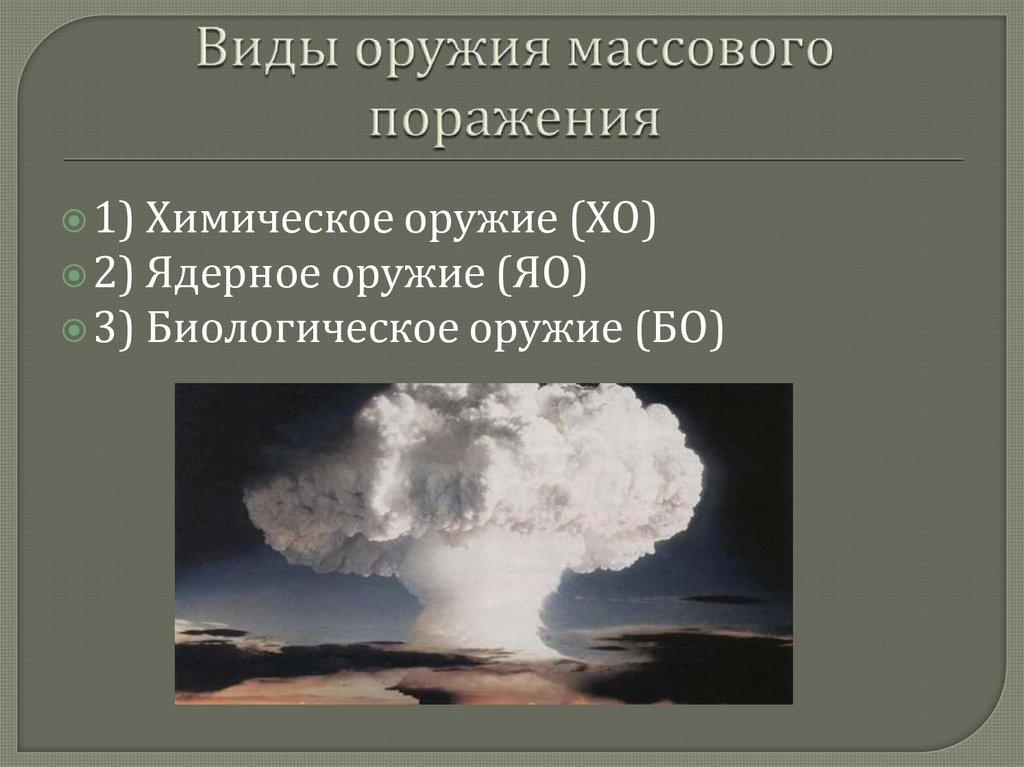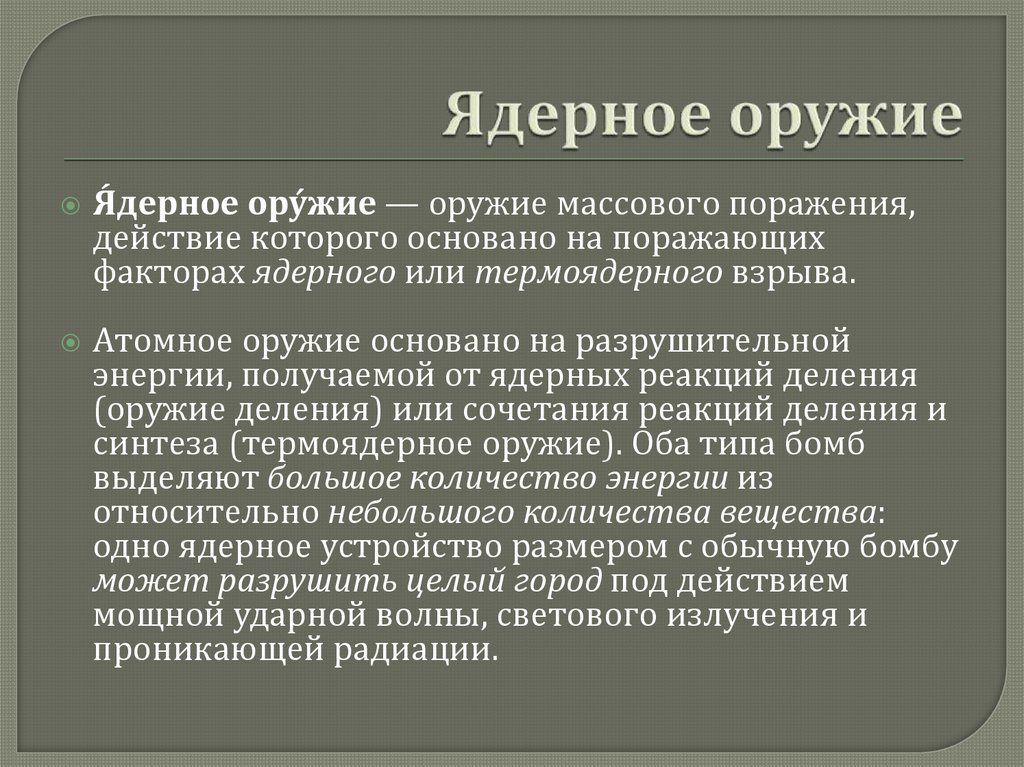 Я́ дерное ору́ жие — оружие массового поражения,действие которого основано на поражающих