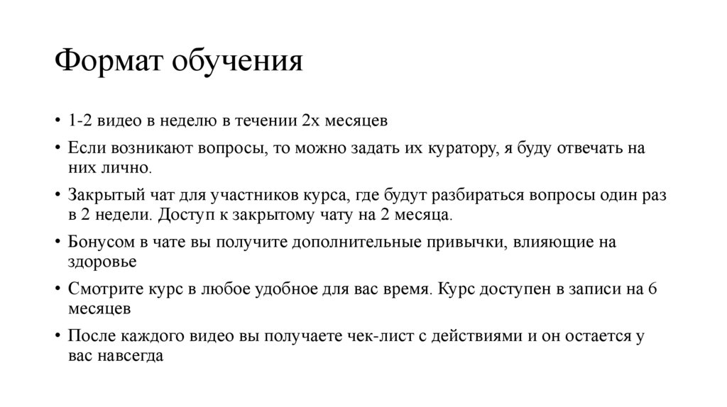 Формат обучения• 1-2 видео в неделю в течении 2х месяцев
