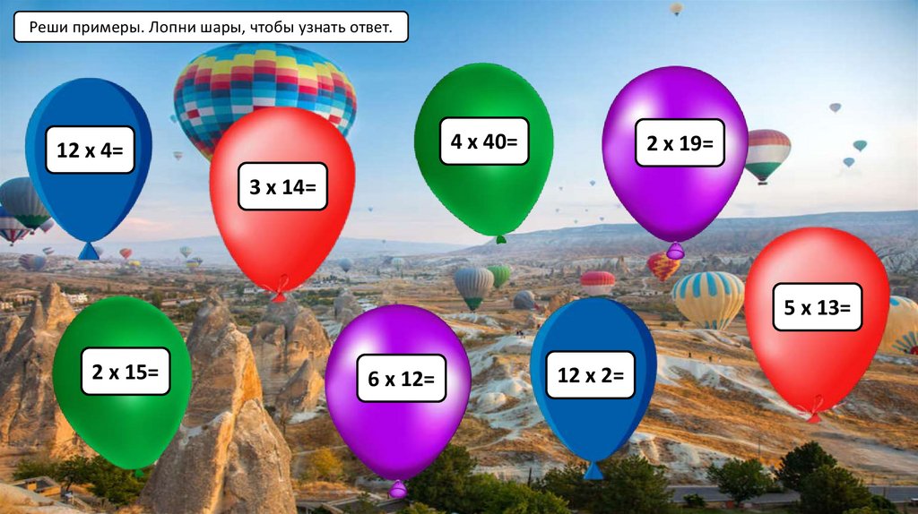 Реши примеры. Лопни шары, чтобы узнать ответ.