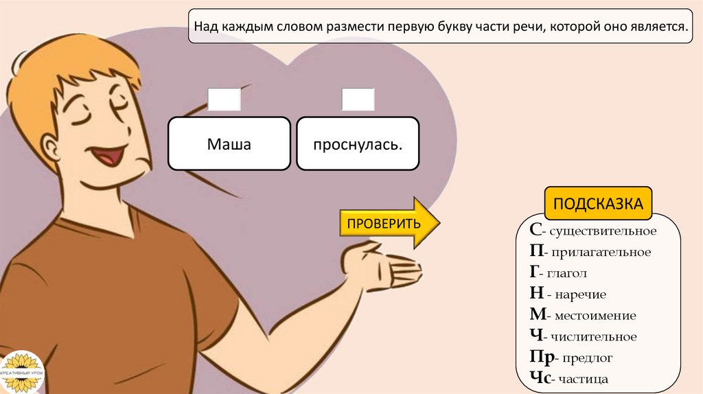 Над каждым словом размести первую букву части речи, которой оно является.Маша
