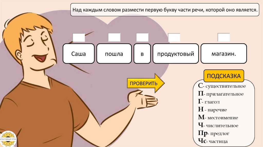 Над каждым словом размести первую букву части речи, которой оно является.Саша